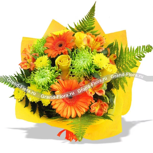 Стандартный: гербера оранжевая - 2 шт., роза желтая (60 см) - 3 шт., хризантема кустовая желтая - 2 шт., альстромерия оранжевая - 3шт., хризантема зеленая (шамрок) - 3 шт., декоративная зелень, фетр желтый.