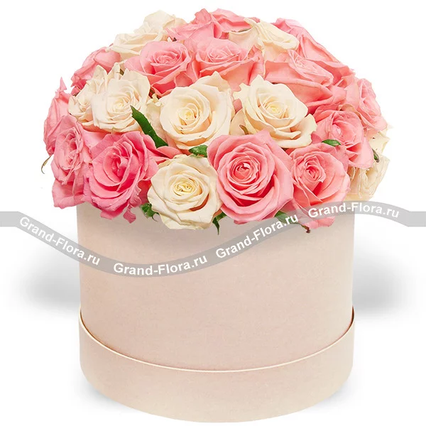 25 роз: роза кенийская розовая - 13 шт., роза кенийская кремовая - 12 шт., коробка круглая средняя, оазис.